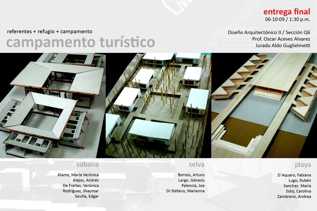 Para esta ocasión se plantea la realización un único proyecto, titulado Campamento turístico. Como punto de partida se procede al diseño de un refugio. Este se planteará como una unidad mínima habitacional, la cual deberá contar con un área de estadía, un área de descanso, un área de servicio (baño), y un área de almacenamiento (pequeño depósito o closet). Para albergar estas áreas, el refugio deberá ser concebido como una unidad cerrada pero con la posibilidad de abrirse o expandirse, para poder aumentar sus dimensiones y condiciones espaciales. A partir del refugio original, se deberá crear un campamento turístico de baja escala. Dicho campamento deberá contar con un área de estacionamiento, un área de recepción/servicios y un mínimo de 15 unidades habitacionales, las cuales serán generadas a partir de la repetición de los refugios diseñados. Los refugios deberán sufrir modificaciones mínimas necesarias en su diseño original para dejar de funcionar de manera aislada y así poder conformar un conjunto.