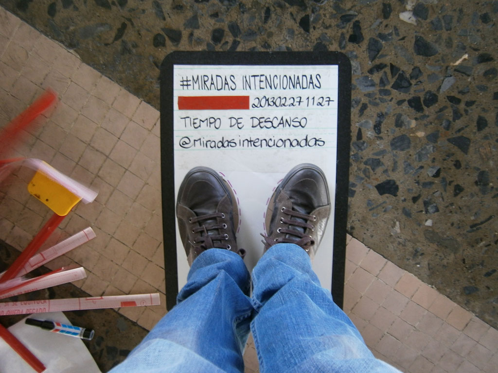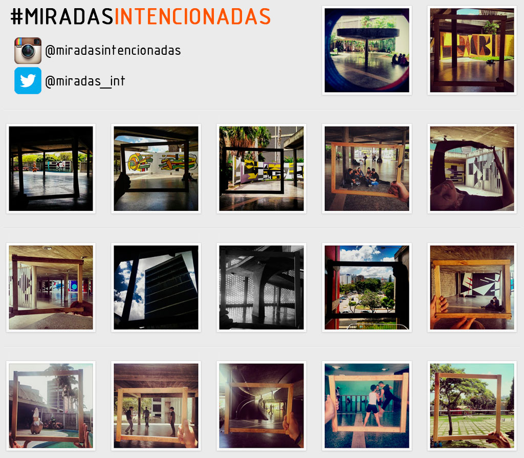 #Miradas Intencionadas consiste en la selección de «miradas» de lugares de interés con la intención de que la vista del observador inicial pueda ser replicada y compartida por otros observadores. Para que esta sensación pueda ser repetida de la manera más exacta posible a la original se coloca una señal en el piso que contiene la información para realizar la experiencia. En esta señal se encuentran unas huellas que marca la posición en que debe colocarse el observador junto a un texto con el nombre escogido para la «mirada», el nombre del observador inicial y la categorización de la misma. Finalmente se invita al observador a tomar una fotografía de su «mirada» y compartirla a través de las redes sociales. La experiencia piloto se contó con 16 «miradas» de los espacios de la Plaza Cubierta de la Ciudad Universitaria de Caracas, utilizando como observador a @miradasintencionadas (Instagram) y/o @miradas_int (twitter). Las fotos de las «miradas» realizadas se pueden ubicar en las redes sociales bajo el hashtag #miradasintencionadas, clasificadas en cuatro categorías: arquitectura (azul), arte (amarillo), paisaje (verde) y actividades (rojo).